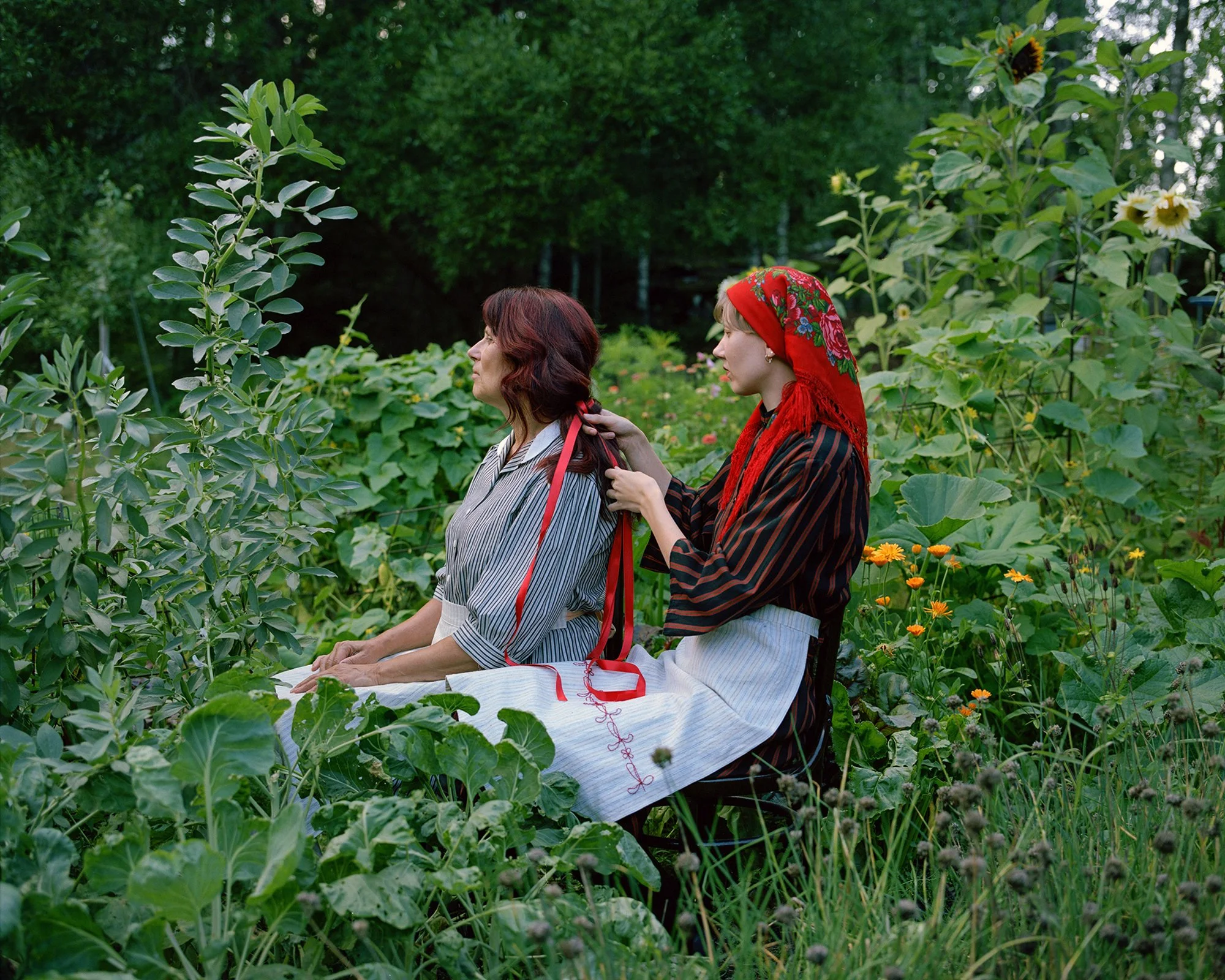 Ruskieloi solmiloi (Red Tangles) depicts a story through the heritage of a Karelian family, searching for visible and hidden fragments of Karelian culture that have unnoticeably persisted within daily life. In Tuomi’s works, their mother’s red hair, Karelian folk clothing they sewed themselves and textiles inherited from their evacuee grandmother become storytellers alongside photography. The domestic and personal materials weave the works into an archive of collective memory, intergenerational knots, and living Karelian heritage.